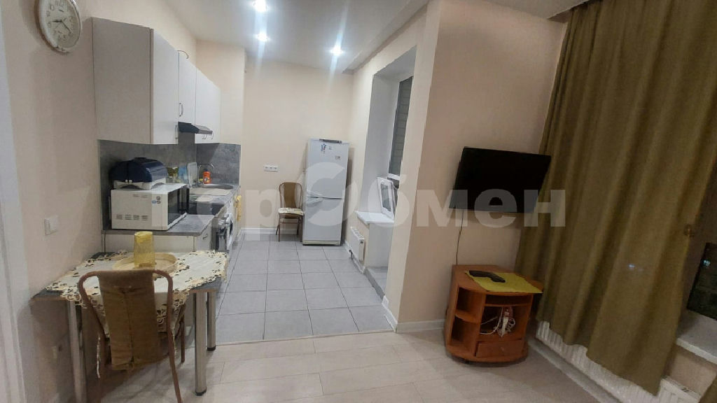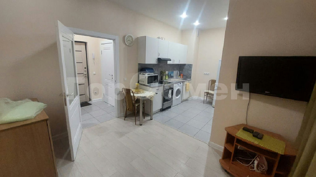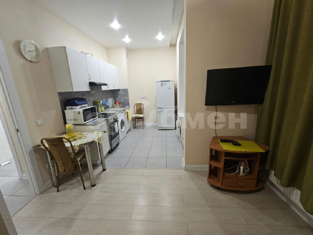 В студии есть все для комфортного проживания (встроенная кухня, холодильник, стиральная машина, телевизор)