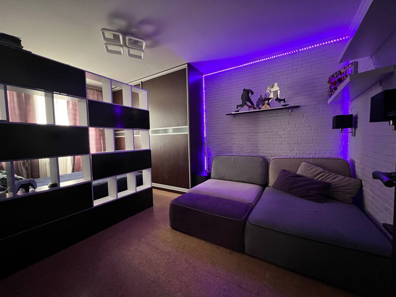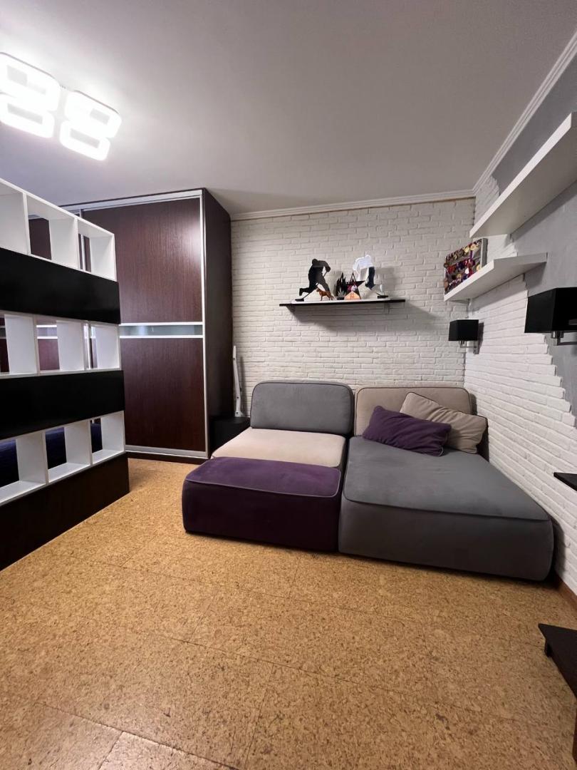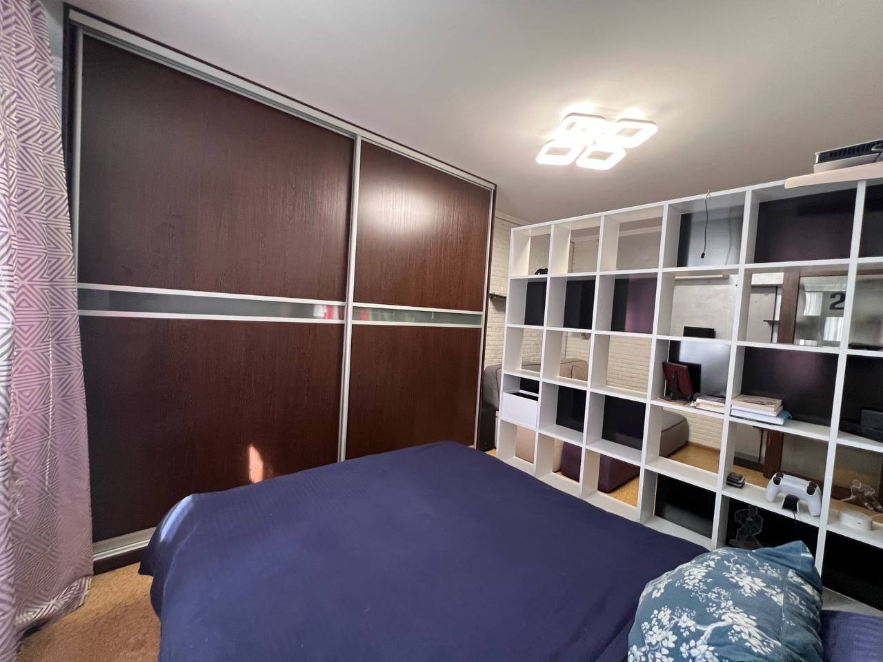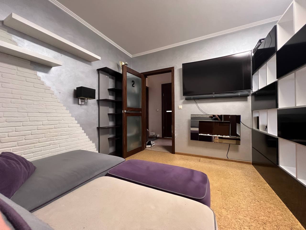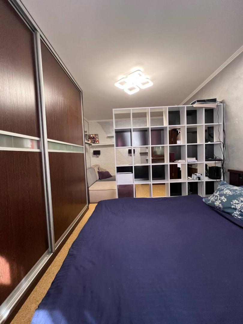 В комнате: встроенная мебель и техника, электрический камин Electrolux, кондиционер, кровать с подъемным механизмом и местом для хранения. Огромный шкаф, 2 стеллажа, ортопедический диван MOON.