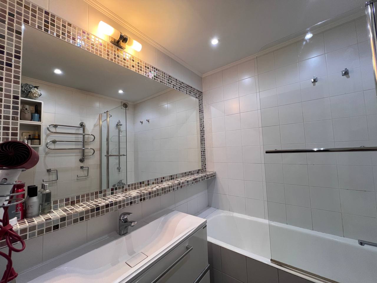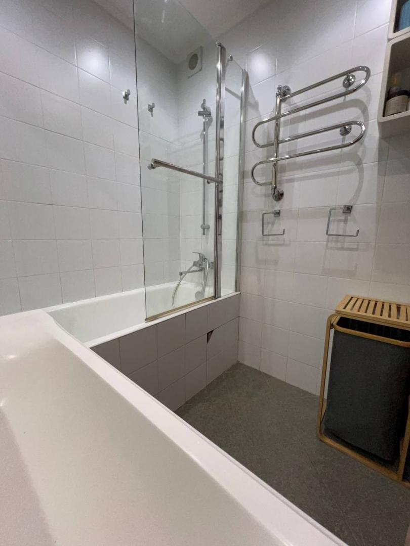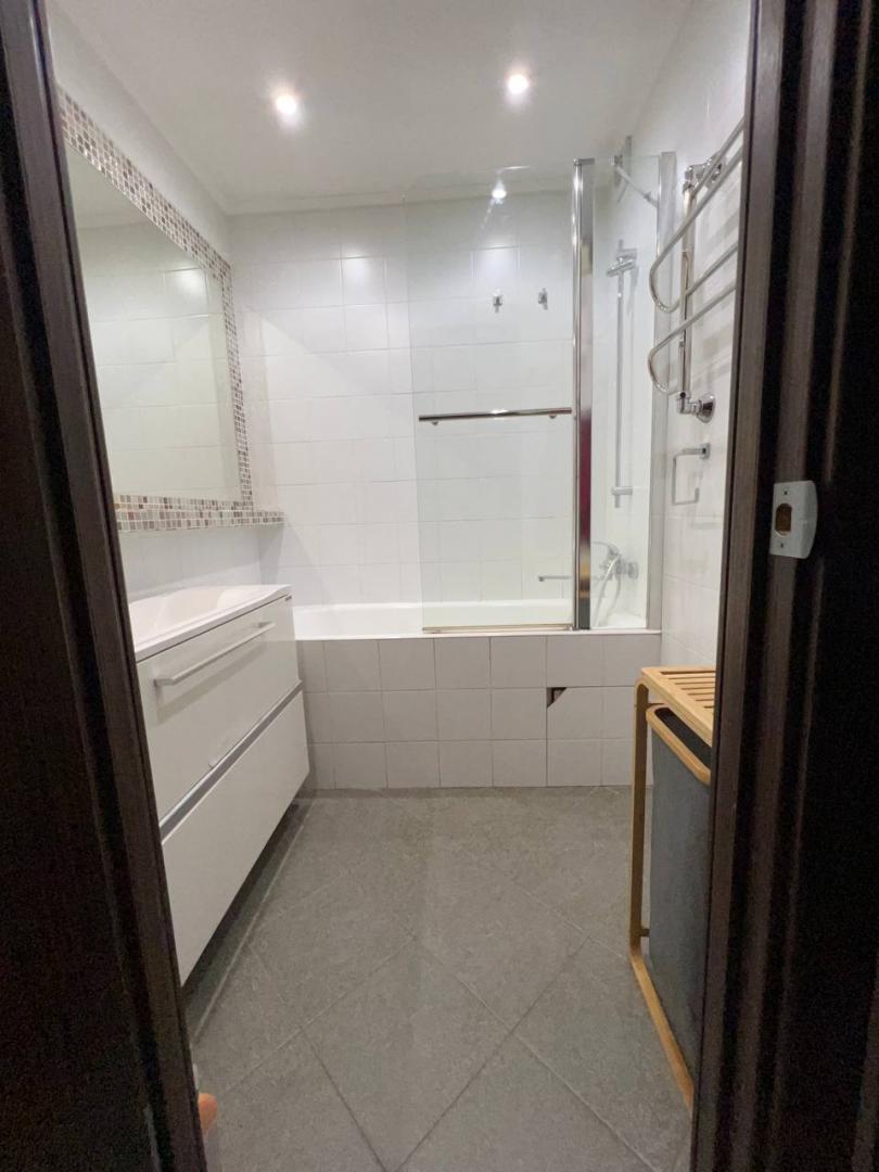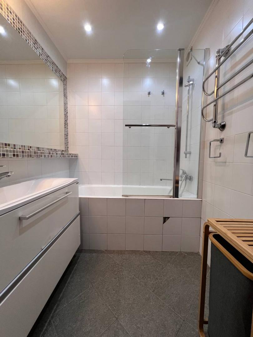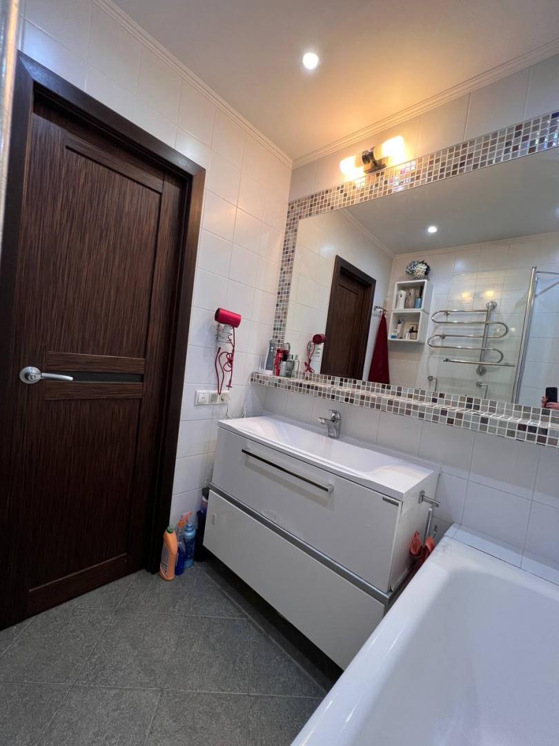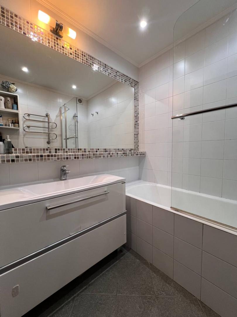 В ванной: качественная сантехника, зеркало во всю стену, теплый пол, полотенцесушитель с круглогодичным подогревом.