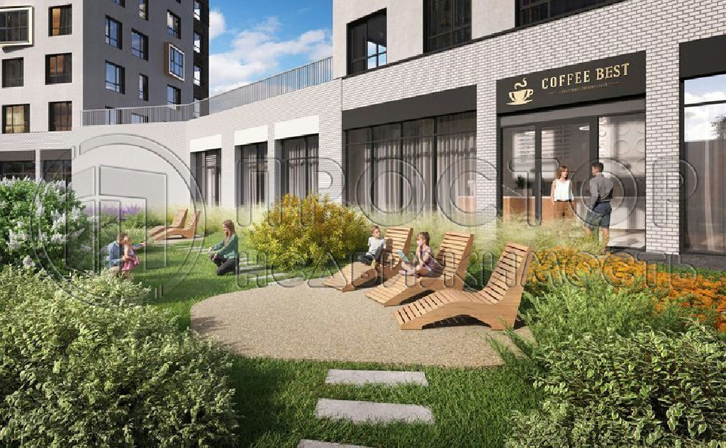 на первых этажах торговая галерея с кофейнями, магазинами и сервисами.