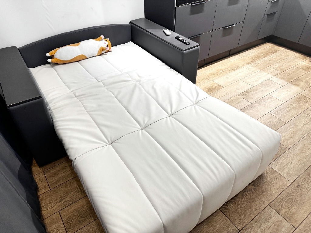 - Диван в гостиной с механизмом бабочка на металлокаркасе и обивкой из Эко-кожи.