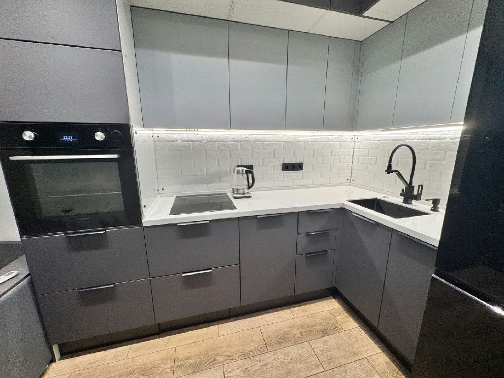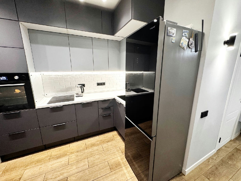 - Вся мебель изготовлена на заказ под эту квартиру, фасады эмалированные, фурнитура с доводчиками.
