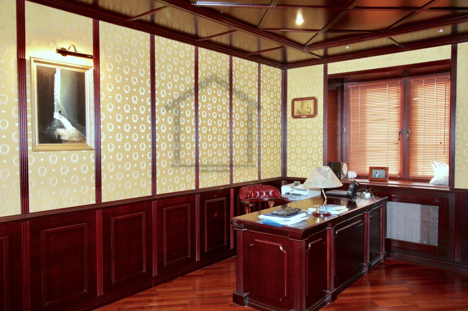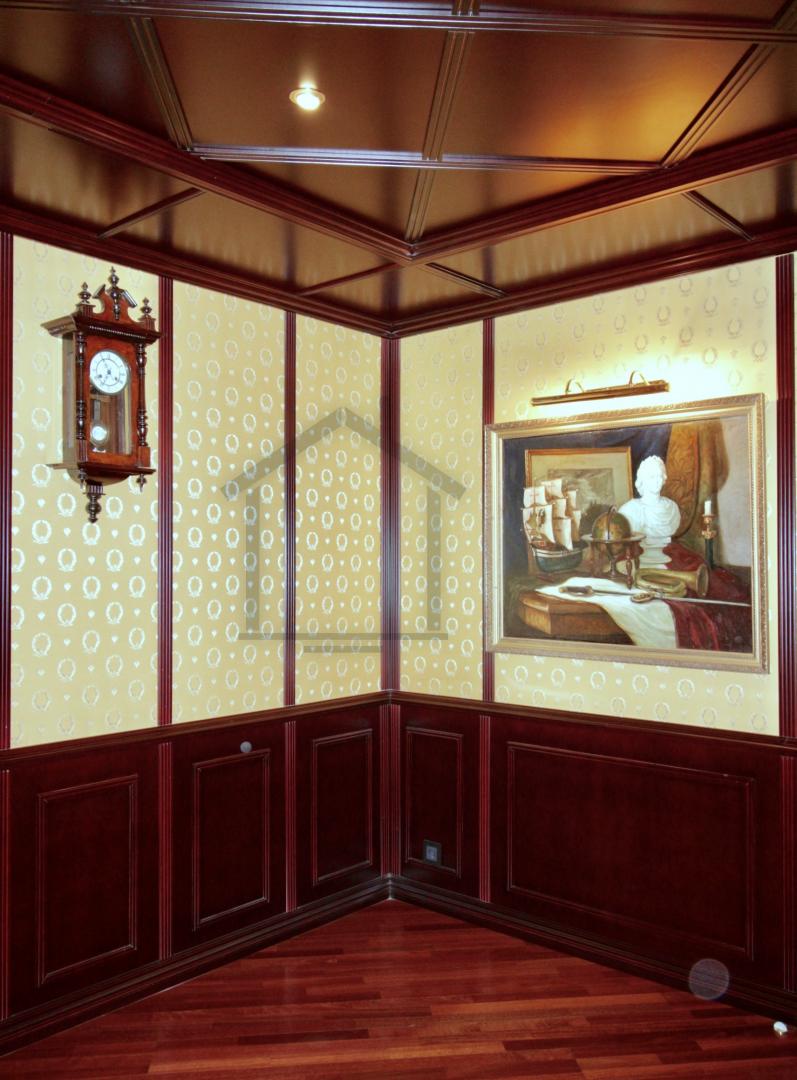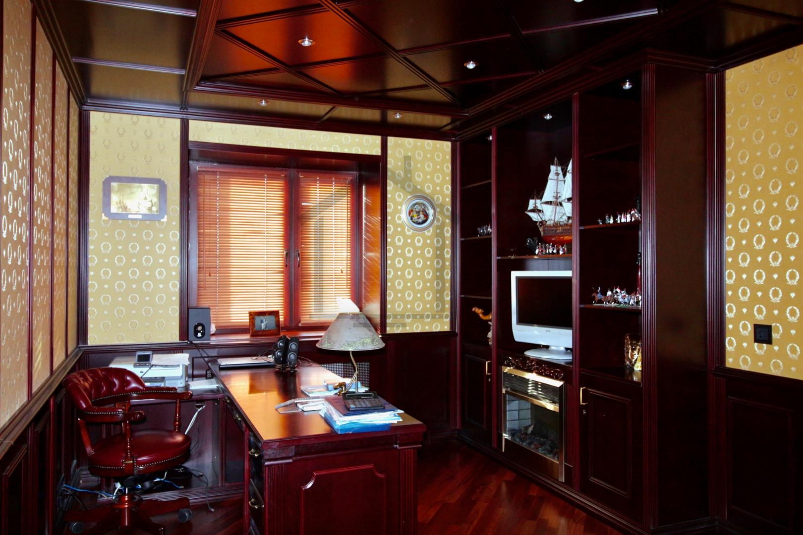 Вся мебель и отделочные материалы кабинета выполнены по индивидуальному проекту, под заказ, натуральное дерево. Камин электрический Dimplex